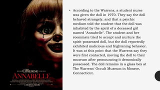 A student nurse was given a doll in 1970 which exhibited strange and malicious behavior. A psychic medium told the student the doll was possessed by the spirit of a deceased girl named Annabelle. The Warrens, paranormal investigators, took possession of the doll after declaring it demonically possessed. The doll remains locked in a glass box at the Warrens' Occult Museum.