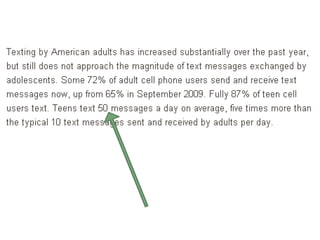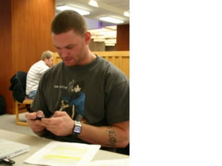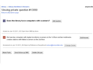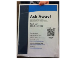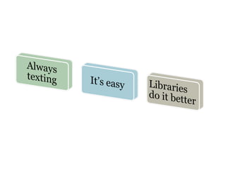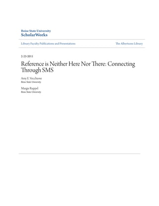 The document discusses the potential of SMS services for library reference, highlighting that 72% of adults with cell phones use text messaging. It presents survey data showing that a significant percentage of libraries offer SMS reference services, and outlines user preferences and feedback regarding the advantages and disadvantages of using SMS versus traditional reference desks. The authors emphasize the need for libraries to adopt SMS to reach new user demographics and improve accessibility.