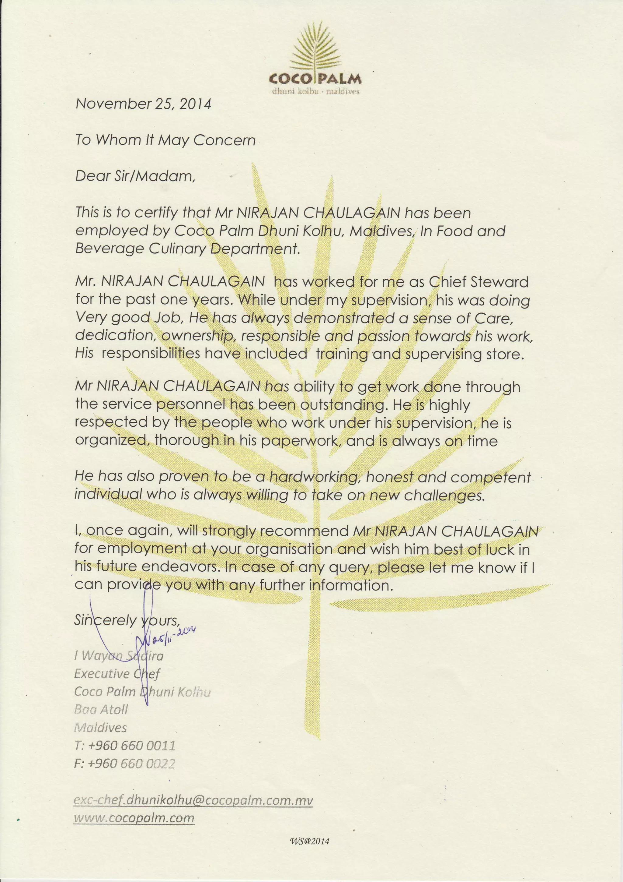 Mr. Nirajan Chaulagain worked as the Chief Steward at Coco Palm Dhuni Kothu in the Maldives for over one year. His responsibilities included training and supervising staff. He demonstrated a strong work ethic and was highly respected by his subordinates. His supervisor recommends him for employment, praising his dedication, organization, timeliness, and willingness to accept new challenges.