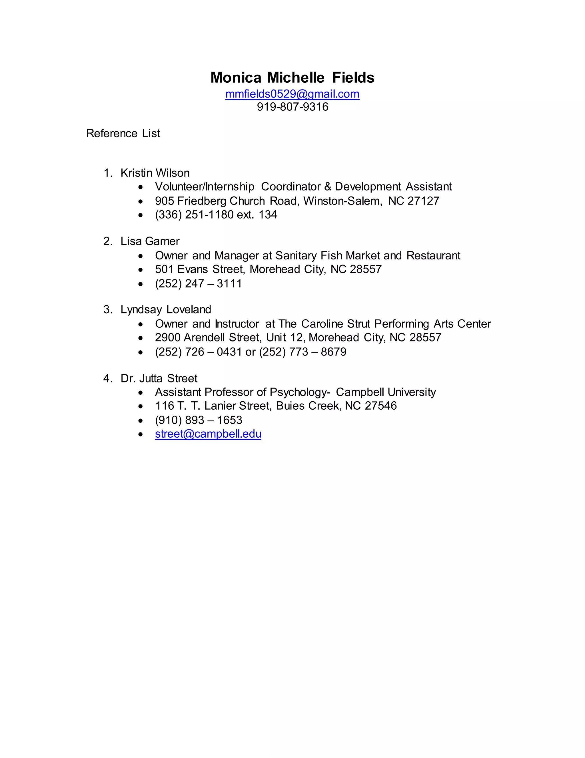 This document contains Monica Fields' contact information and a reference list of 4 people who can provide references for her. It lists each reference's name, title, organization, address, and phone number. The references include a volunteer coordinator, restaurant owner and manager, performing arts center owner and instructor, and an assistant psychology professor at Campbell University.