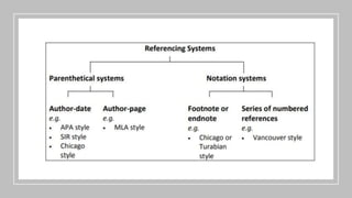 This document discusses reference management and citation styles. It begins by outlining the key reasons for adding references: to give credit, add credibility, and help readers find more information. It then discusses impact factor and h-index as measures of scholarly impact. Different citation styles like APA, MLA, and Chicago are presented. The challenges of different styles are noted. Finally, the document introduces reference management software like Mendeley, describing its key features like the web importer tool and MS Word plugin to facilitate reference management.