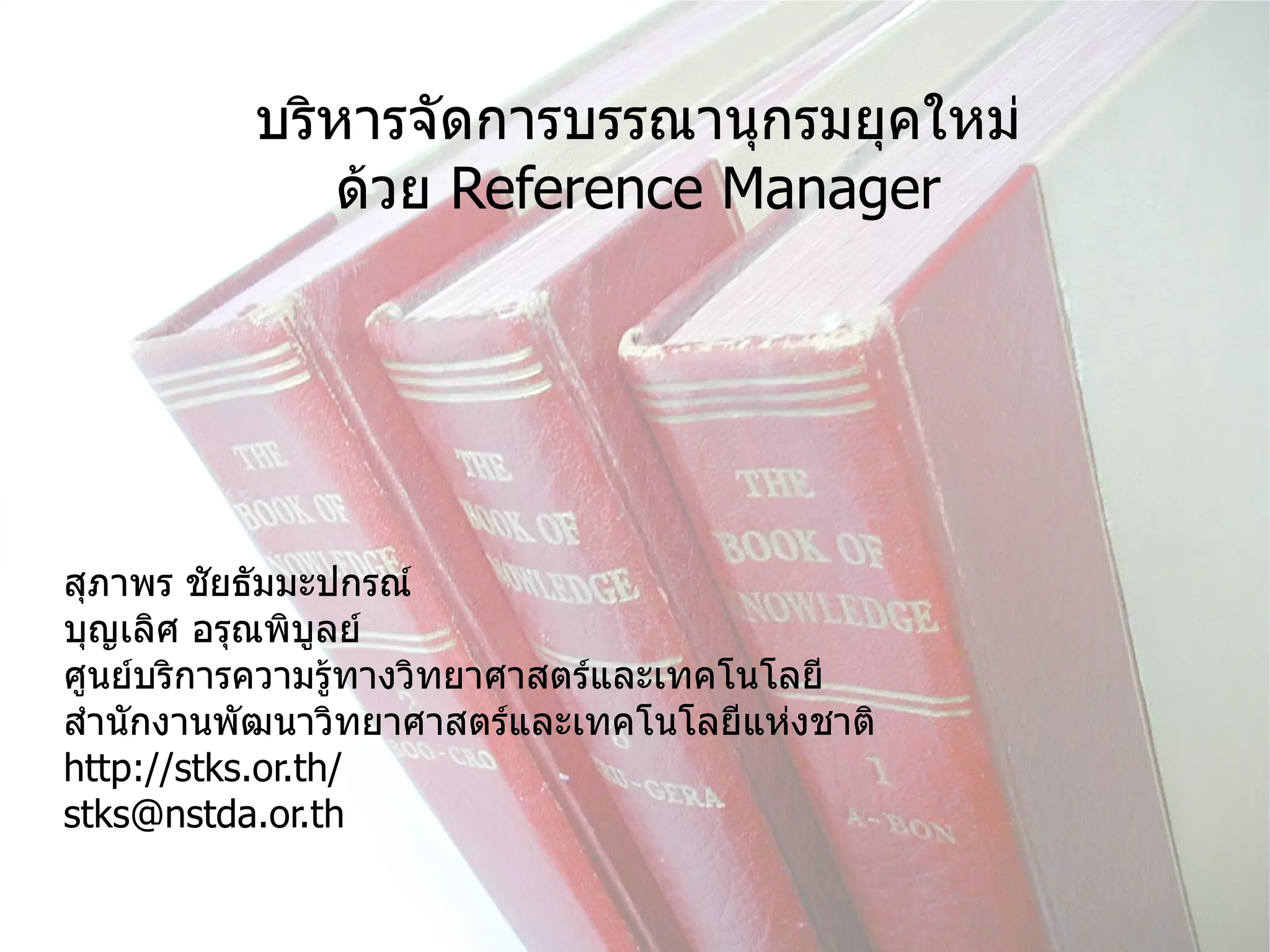 รูปแบบบรรณานุกรมที่หลากหลาย บุญเลิศ อรุณพิบูลย์(boonlert@nstda.or.th). 2552. “Twitter for Libraries.” จดหมายอิเล็กทรอนิกส์ถึง สุภาพร ชัยธัมมะปกรณ์ (supapornc@nstda.or.th) 19 มิถุนายน. MacKenzie, Smith and others. 2003. “DSpace : An Open Source Dynamic Digital Repository.” D-Lib Magazine. [Online] Available http: http://www.dlib.org/dlib/january03/smith/01smith.html (19 June 2009).