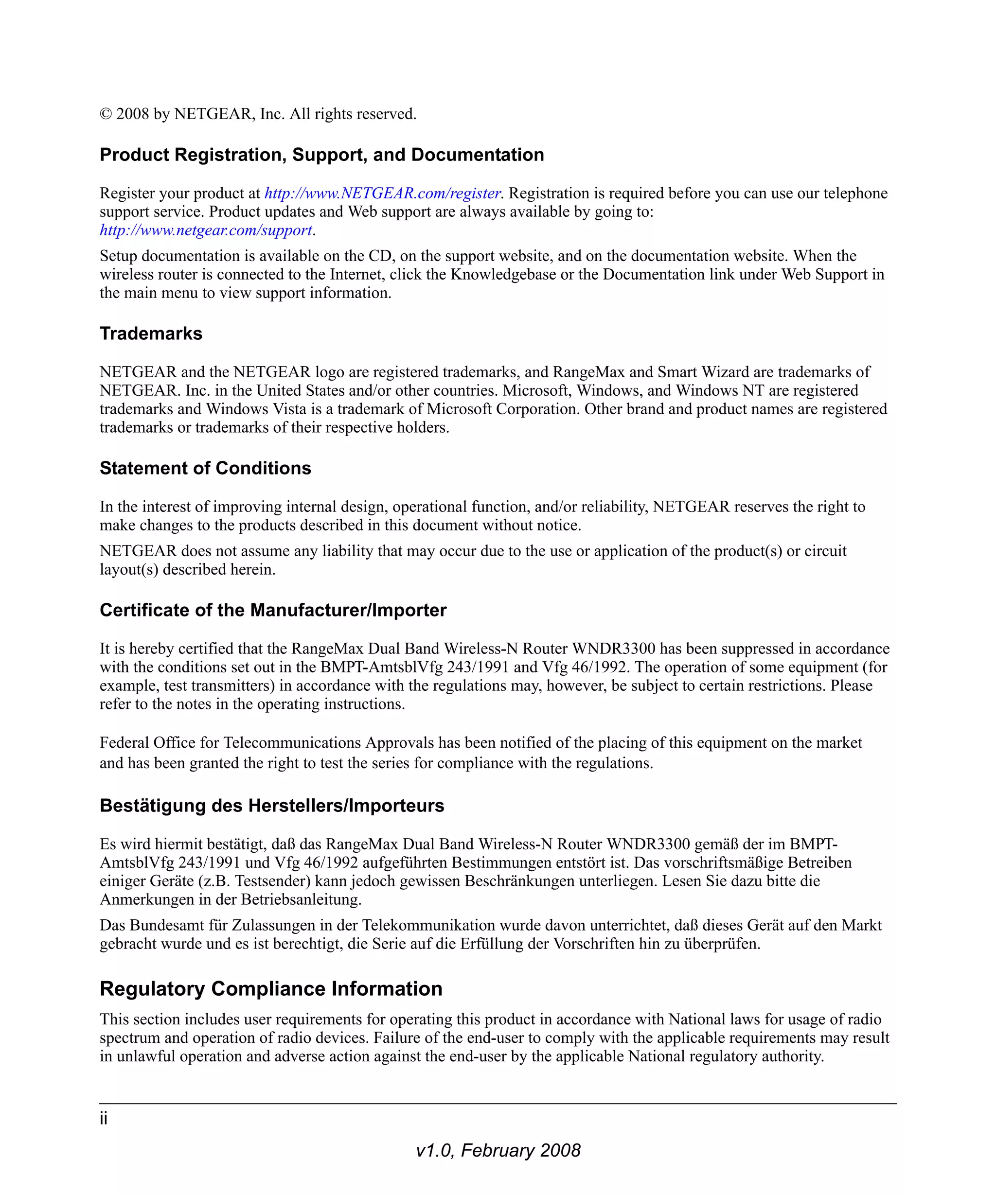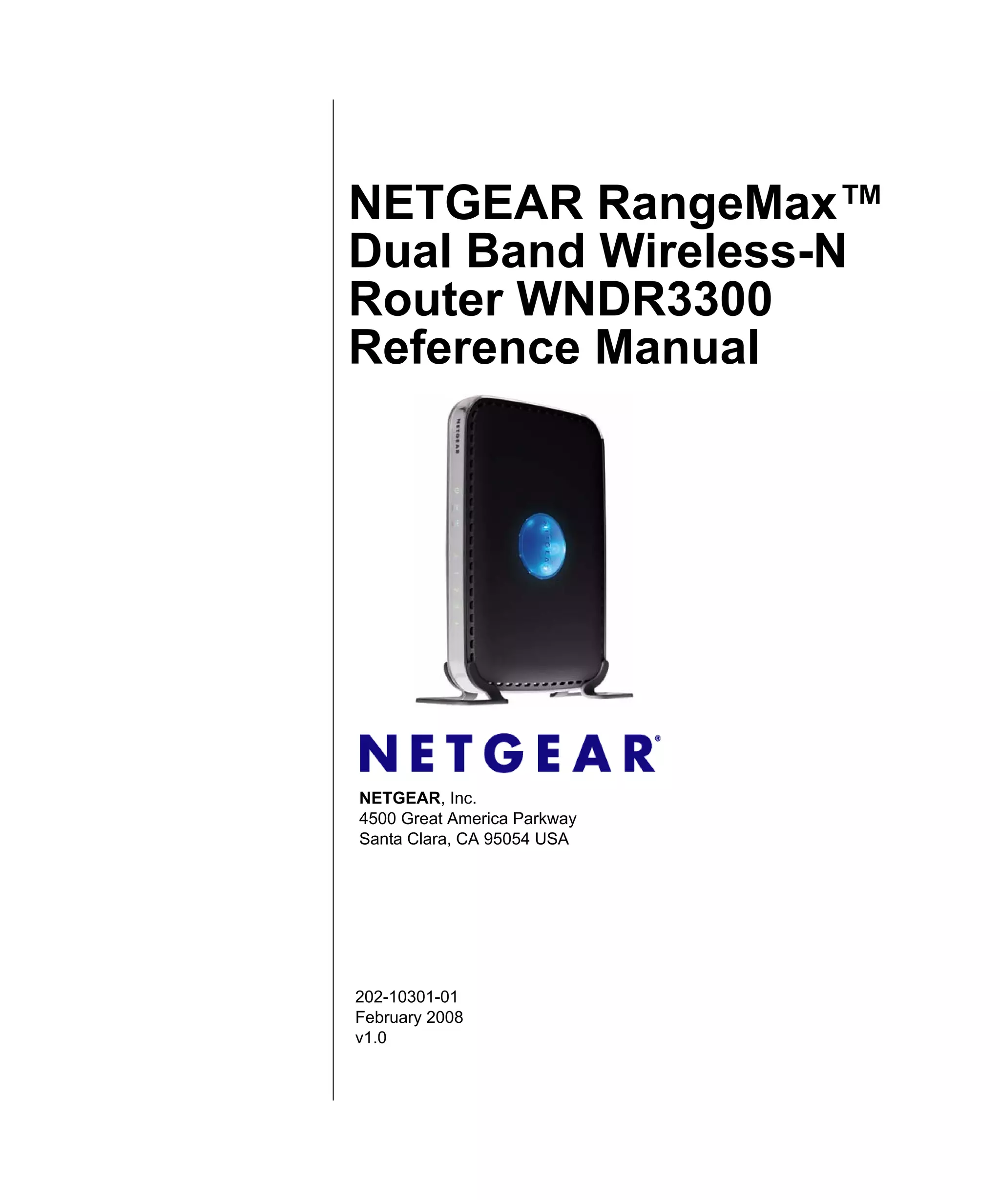 This document is the reference manual for the NETGEAR RangeMax Dual Band Wireless-N Router WNDR3300. It includes information about product registration, support, documentation, trademarks, conditions of use, regulatory compliance, and the product details. The manual provides documentation on basic setup, configuration, security, access restrictions, and customization of network settings for the wireless router. It contains information to help users safely setup and manage their home or small office wireless network.