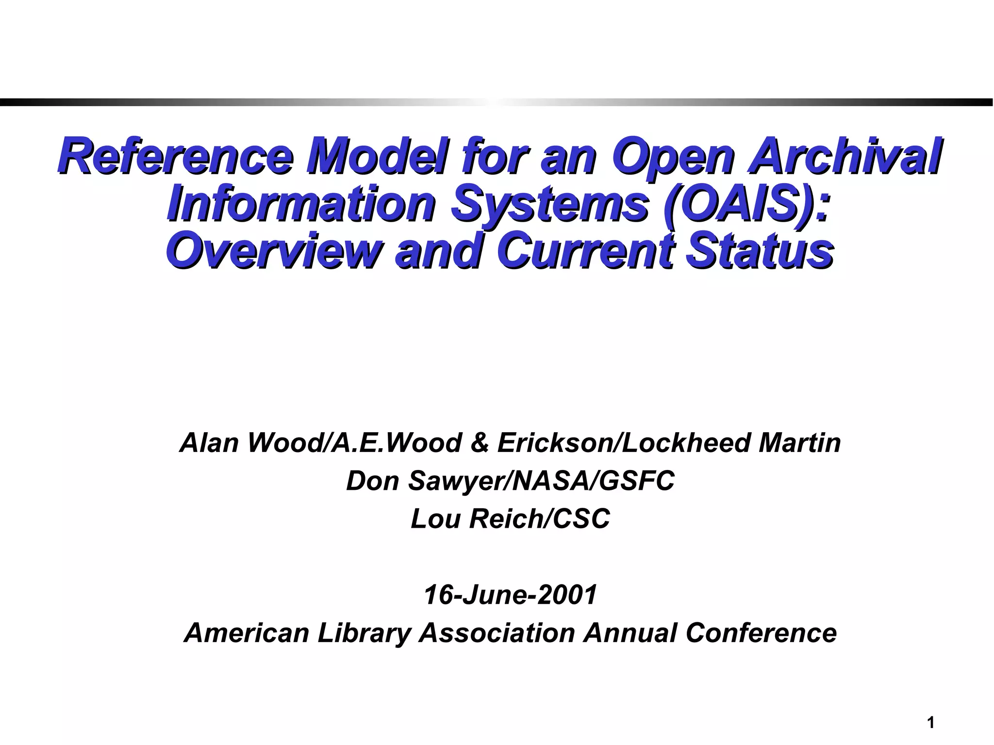 The document provides an overview of the Reference Model for an Open Archival Information System (OAIS), outlining its purpose, motivation, and the significance of establishing a standardized framework for the long-term preservation of digital information. It discusses the challenges posed by evolving technologies and the need for consistent metadata and archiving practices across various organizations. The document concludes with the status of the reference model, highlighting ongoing developments and its application in supporting diverse archival initiatives and standards.