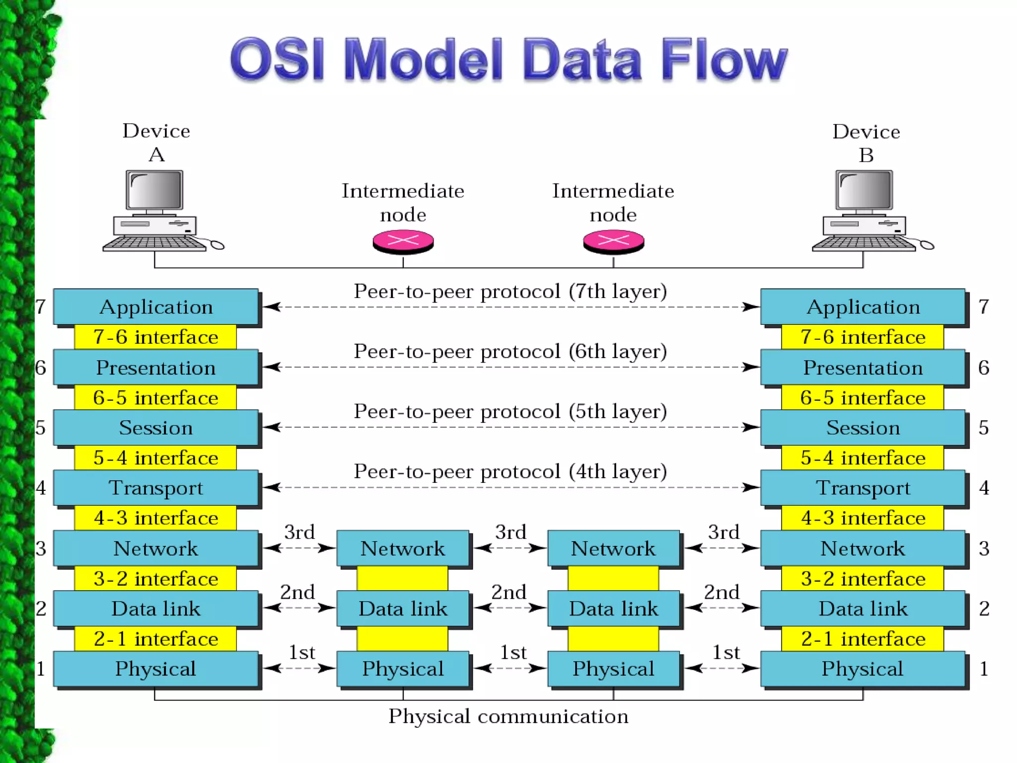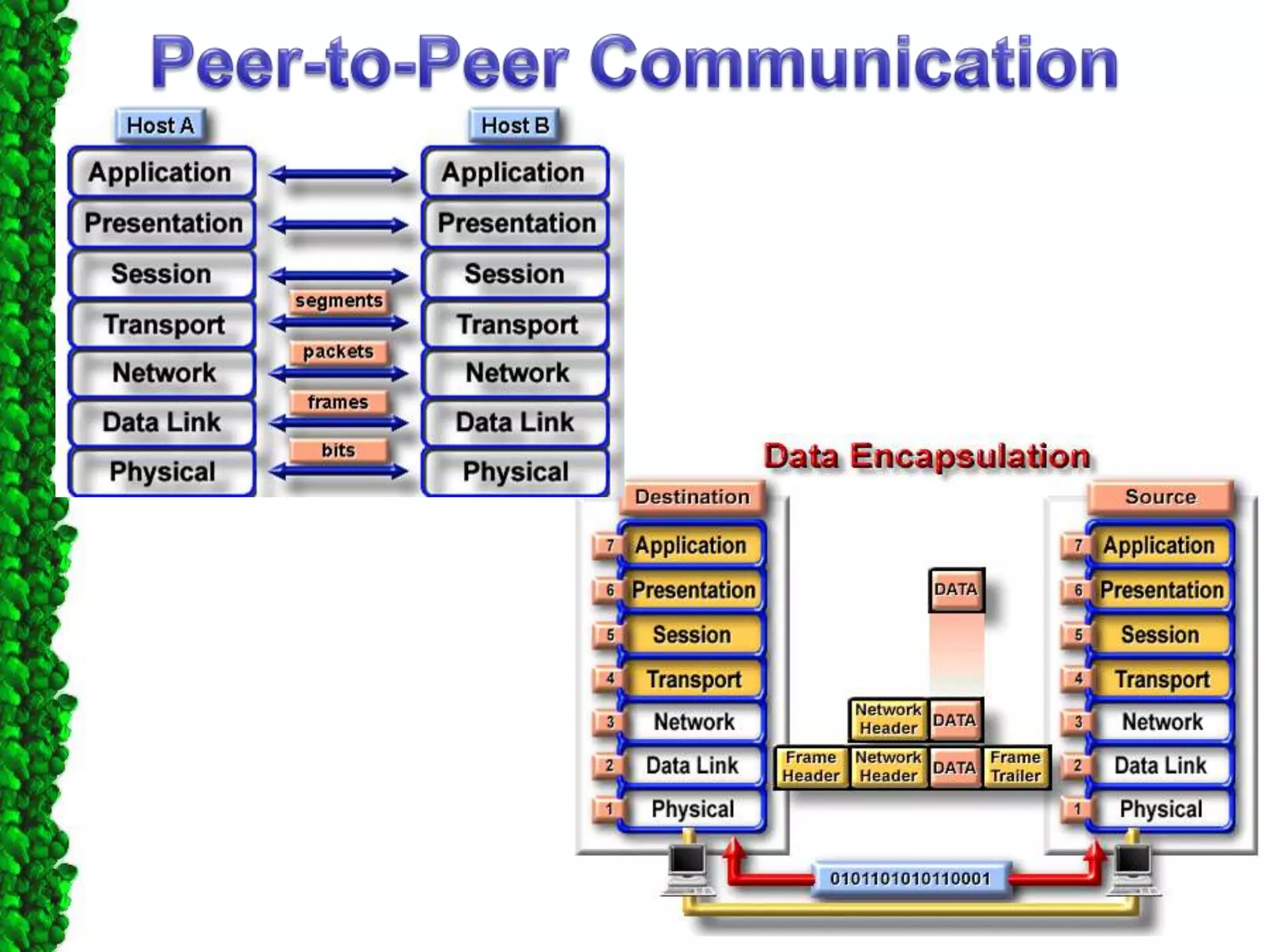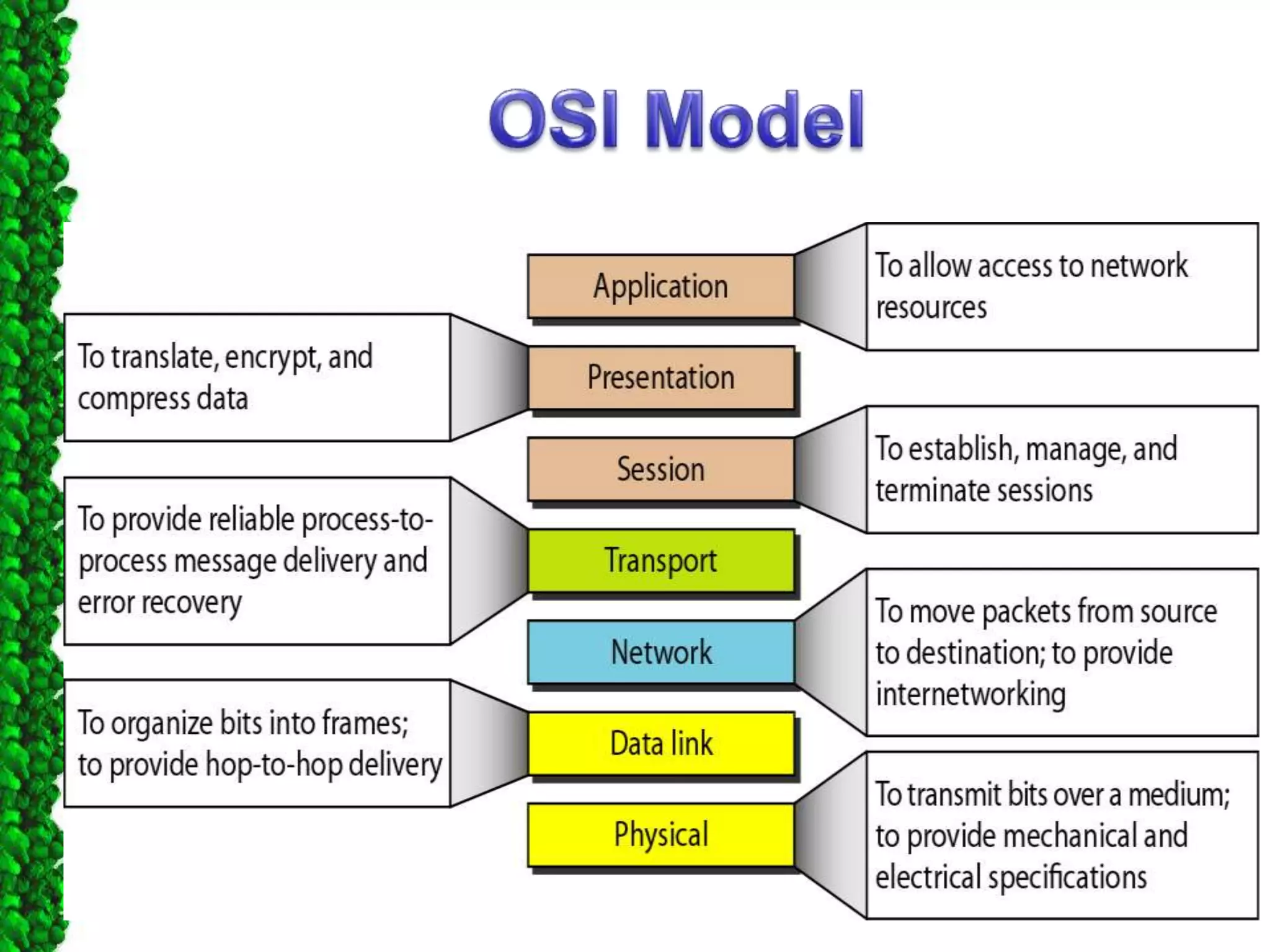 - Each of the seven layers of the OSI model, describing their functions and responsibilities for moving data through the network.