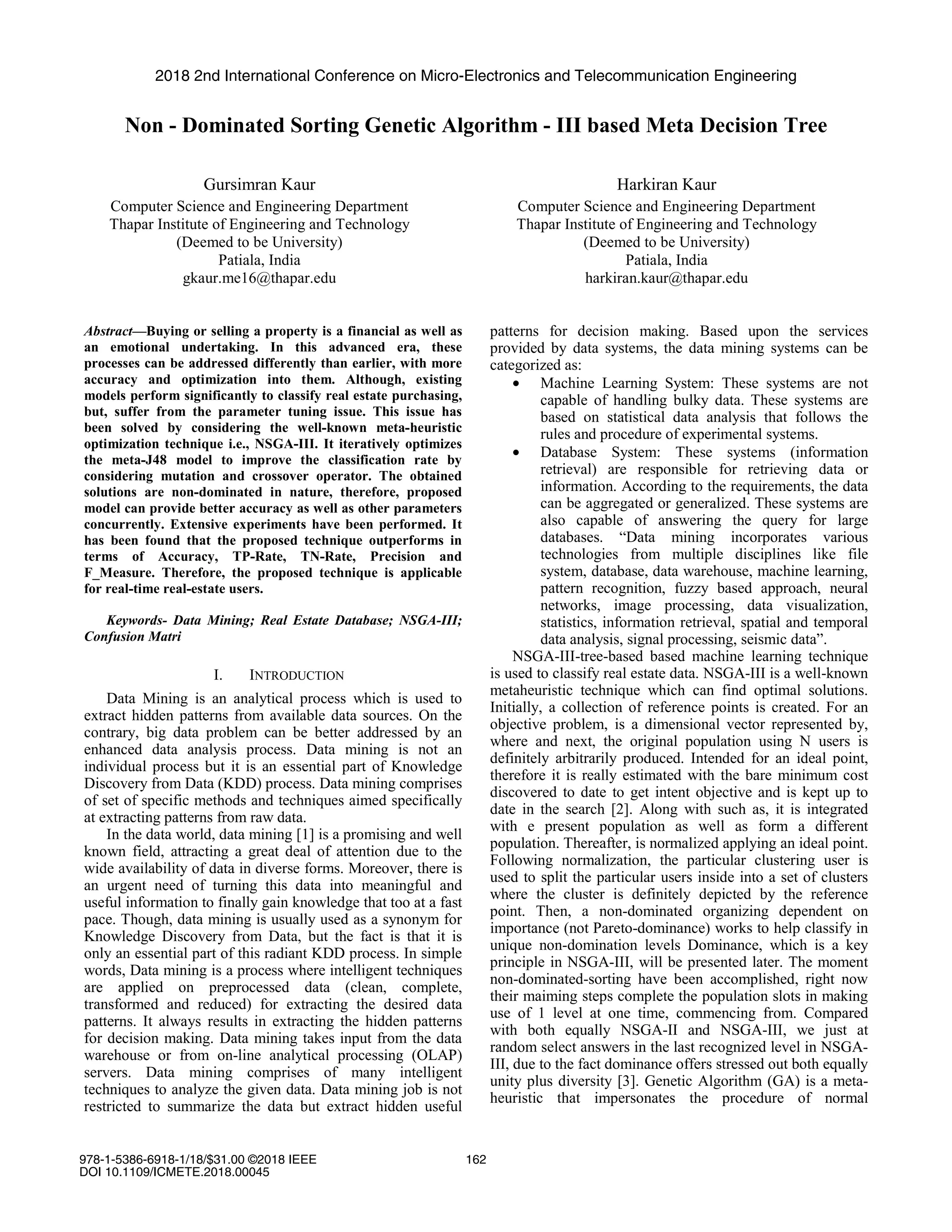 The document discusses using a NSGA-III-based meta decision tree to classify real estate data. NSGA-III is a metaheuristic optimization technique that can find optimal solutions. It is used to iteratively optimize the parameters of a meta-J48 decision tree model to improve classification accuracy of real estate data. Experimental results found the proposed NSGA-III technique outperformed other methods in terms of accuracy, true positive rate, true negative rate, precision, and F-measure. Therefore, the technique is applicable for real-time real estate users.