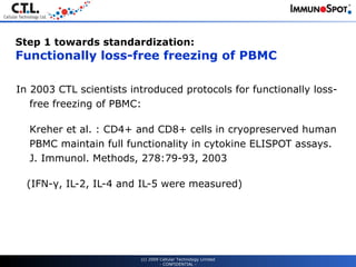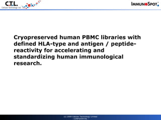 The document discusses the development and benefits of cryopreserved human peripheral blood mononuclear cell (PBMC) libraries with defined HLA types and antigen reactivities. Key points include: