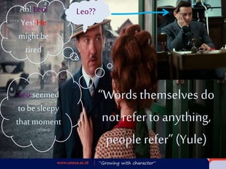 This document discusses the concepts of reference and inference in pragmatics. It defines reference as using linguistic forms like referring expressions to identify things, and inference as connecting prior knowledge to understand implied meanings beyond what is directly stated. There are four main categories of referring expressions: proper nouns, definite noun phrases, indefinite noun phrases, and pronouns. For successful reference, both the linguistic context and physical context must be considered to determine the intended referent. Reference relies on anaphora to continue identifying entities, while ellipsis and implicature also play a role through omitted references understood through inference.