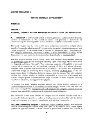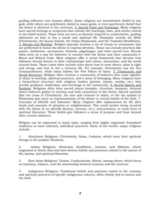 The document explores the concepts of religion and spirituality, detailing their definitions, core components, and differences. Religion is characterized as a structured system of beliefs and practices that often involves community, sacred texts, and moral codes, while spirituality is described as a personal journey seeking meaning and connection beyond structured beliefs. It discusses how both serve different functions in individual and communal contexts and highlights the psychodynamic approaches to understanding their psychological influences.