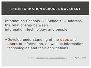 3. The document covers topics like the iSchool movement, usability, gender trends in library and information science education, and assessment of reference services.