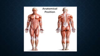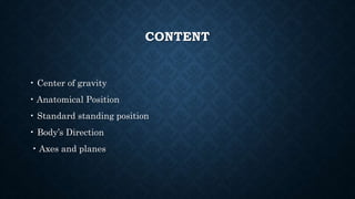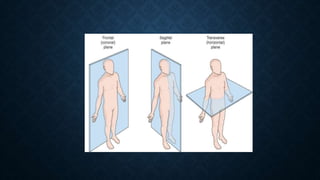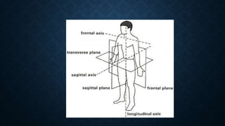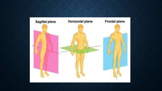This document provides a reference system for analyzing human movement. It defines key anatomical concepts including the center of gravity, anatomical position, and standard standing position. It then describes three planes (frontal, sagittal, horizontal) and three axes (frontal, sagittal, vertical) that are used to analyze movement in relation to the body. The planes are two-dimensional surfaces that divide the body into halves, while the axes are imaginary lines that movements occur around.