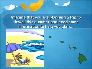 This document provides information about different reference tools that can be used to plan a trip to Hawaii. It discusses dictionaries, encyclopedias, thesauruses, and almanacs. Each tool can help find specific types of information, such as word meanings, overviews of topics, synonyms, or current facts and statistics. Understanding which reference resource to use for what type of information sought will help effectively plan a vacation.