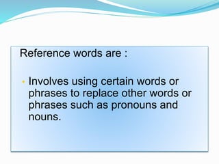 Reference words are used in writing to refer to people, objects, or ideas that have been mentioned previously to avoid repetition. They include pronouns like it, this, and they as well as words like those, former, and latter. Reference words allow the writer to substitute these referring terms for nouns and phrases mentioned earlier in the text for a clearer, more cohesive flow. The document then provides examples of specific reference words and their meanings and functions in writing.