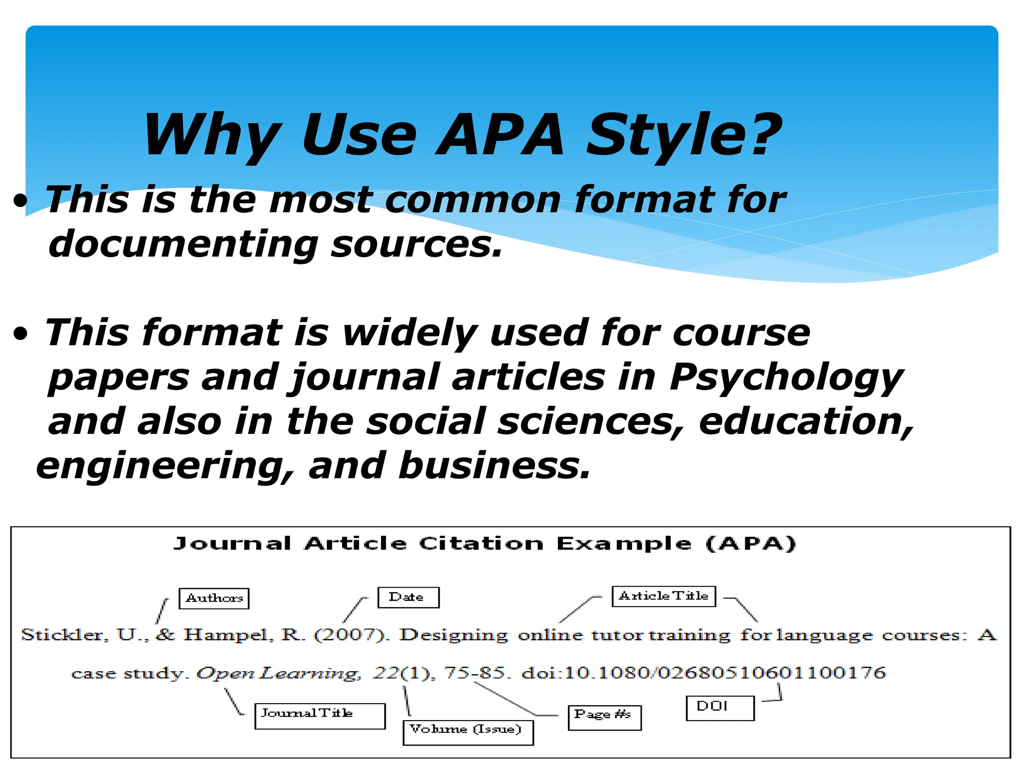 It explains the general formats for different source types and provides examples of how to format in-text citations and reference list entries according to APA style guidelines.