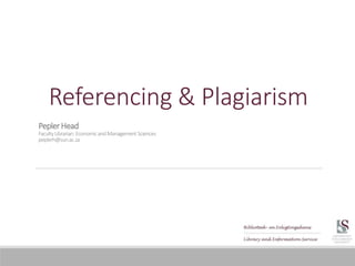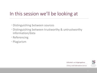 This document discusses distinguishing between different types of sources such as books, journal articles, reports and databases. It also covers evaluating information sources for reliability and authority. The document defines plagiarism and provides examples. It discusses referencing and citing sources to avoid plagiarism. Referencing helps demonstrate your understanding, that you have read widely, and allows others to locate your sources. The document provides tips on referencing styles and consistency.