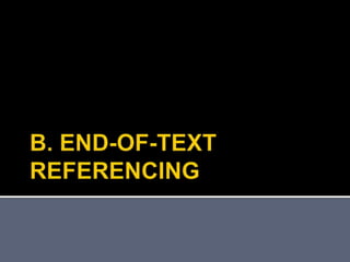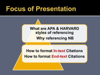 This document provides information on APA and Harvard referencing styles, including how to format in-text citations and reference lists. It discusses the key reasons for referencing, such as avoiding plagiarism and establishing credibility. The document then outlines the formatting guidelines for different source types in both APA and Harvard styles, such as books, journal articles, websites, and more. Specific guidance is provided on issues like citing multiple authors, personal communications, and unpublished works.