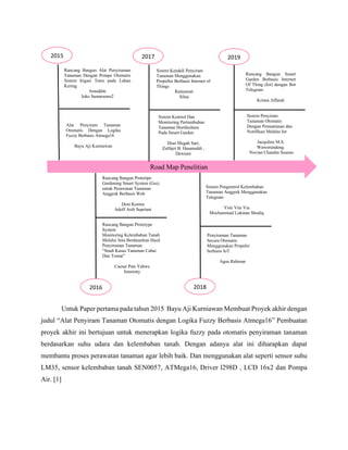 Dokumen ini membahas berbagai proyek penelitian tentang alat penyiram tanaman otomatis yang menggunakan teknologi seperti logika fuzzy dan Internet of Things (IoT) untuk meningkatkan perawatan tanaman. Proyek-proyek tersebut mencakup penggunaan sensor kelembaban tanah, mikrokontroler, dan komunikasi melalui SMS atau aplikasi seperti Telegram dan Blynk untuk monitoring dan kontrol. Hasil dari penelitian ini bertujuan untuk membantu petani dalam mengatasi masalah kekurangan air serta memudahkan pemilik tanaman dalam perawatan.
