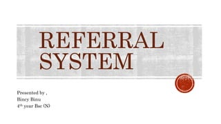 The document discusses referral systems in healthcare. It defines referral as transferring patient care responsibilities from one healthcare professional to another. A good referral system maintains continuity of care as patients move from community to primary to hospital care. The referral process involves communicating relevant patient information between referring and receiving providers. There are various levels and types of referrals depending on factors like a patient's condition and a facility's capabilities. An effective referral system ensures patients receive the appropriate care in a well-coordinated manner across different care levels.