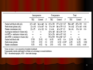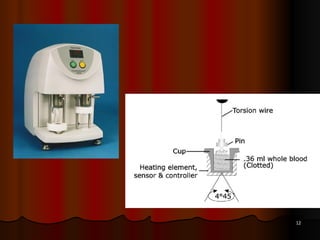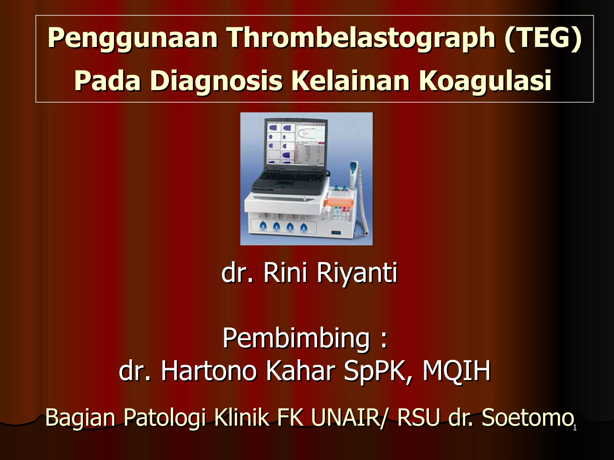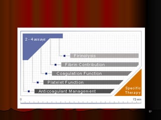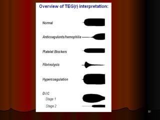 Thrombelastography (TEG) adalah tes koagulasi yang dilakukan di samping pasien untuk mengukur berbagai parameter koagulasi dalam 30 menit. TEG dapat digunakan untuk memantau koagulasi pada operasi jantung dan transplantasi hati serta mendeteksi gangguan koagulasi pada pasien trauma.