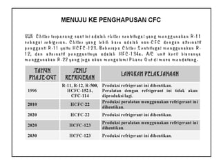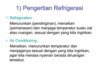 Dokumen ini menjelaskan dasar-dasar refrigerasi, termasuk definisi, istilah, komponen sistem refrigerasi, syarat refrigeran, serta sifat-sifat dari berbagai jenis refrigeran. Selain itu, juga diuraikan fungsi dan perawatan minyak pendingin serta berbagai jenis cold storage dengan temperatur penyimpanan yang berbeda. Informasi ini relevan untuk pemahaman sistem refrigerasi dalam industri perikanan dan penyimpanan makanan.