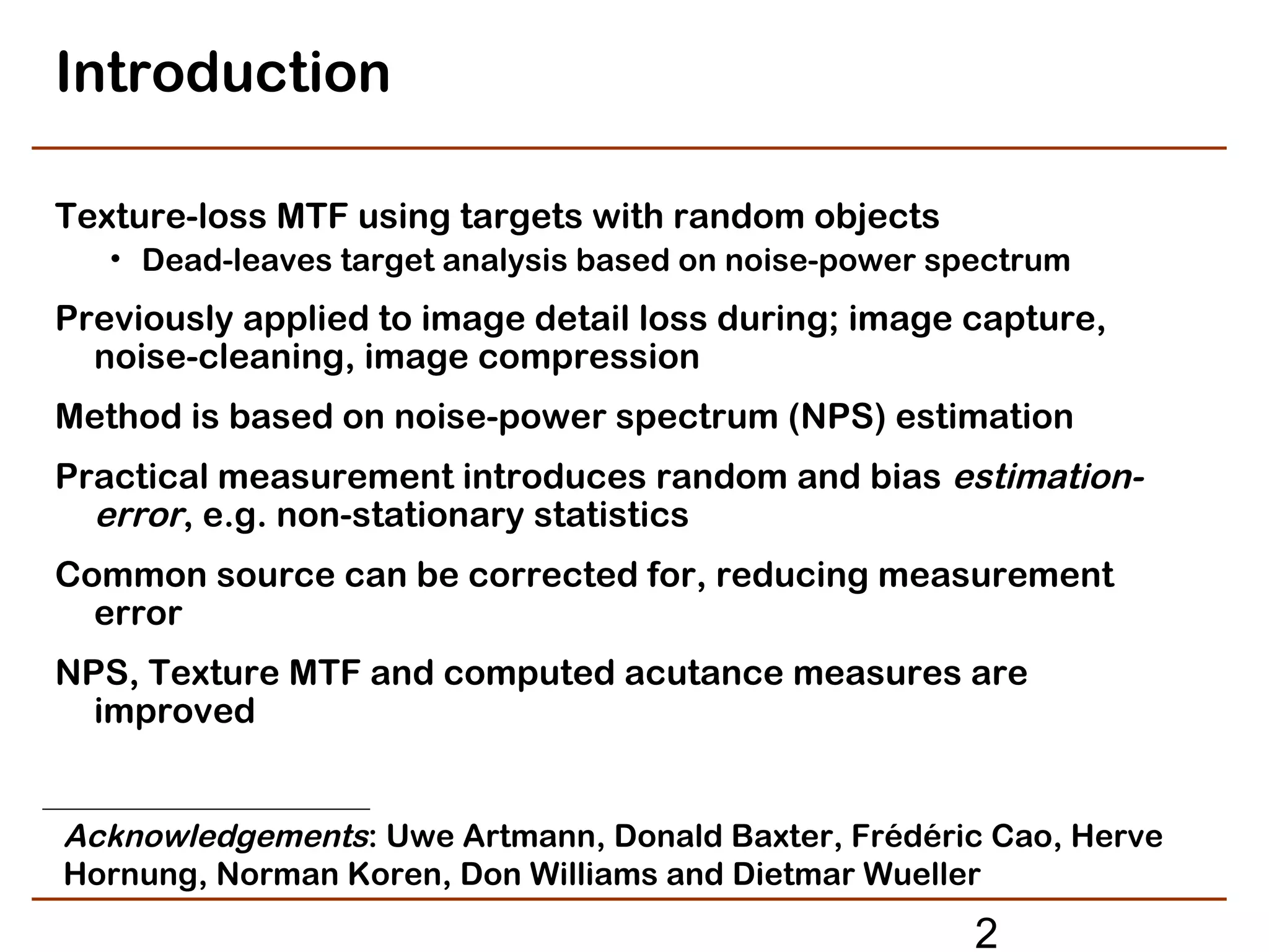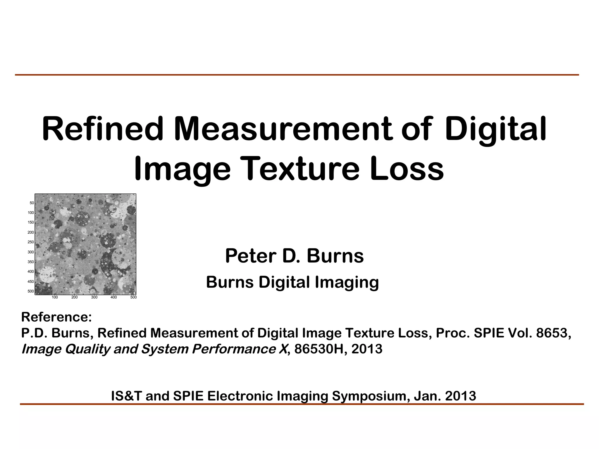 The document discusses refined methods for measuring digital image texture loss using targets with random objects. Specifically, it proposes measuring texture modulation transfer function (MTF) based on analyzing the noise power spectrum of input and output images. This approach aims to provide an effective MTF measure for image areas influenced by adaptive or signal-dependent processing, such as noise cleaning. Key steps involve computing the noise power spectrum of a noisy input target image, applying the imaging system or processing under test, and computing the output noise power spectrum to determine the texture MTF. The method seeks to provide a practical texture loss measurement but must address random and bias errors introduced during estimation of noise power spectra.
