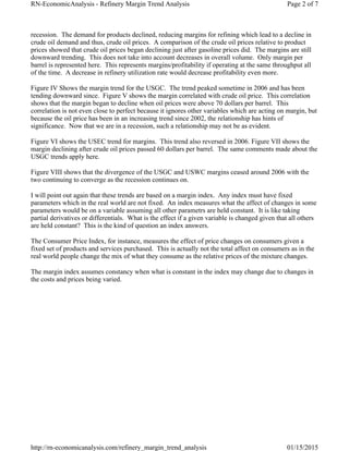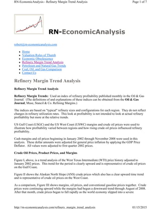 The document analyzes trends in refinery margins from 2002 to 2008. It finds that margins peaked in 2006 and have been declining since, correlating with rises in crude oil prices above $70/barrel on the Gulf Coast and $60/barrel on the West Coast. Charts show margins declining as crude prices continued rising until late 2008 when prices fell rapidly due to reduced demand during the recession. While useful, the margin index analyzed makes assumptions of fixed variables that do not reflect real-world changes to costs and prices over time.