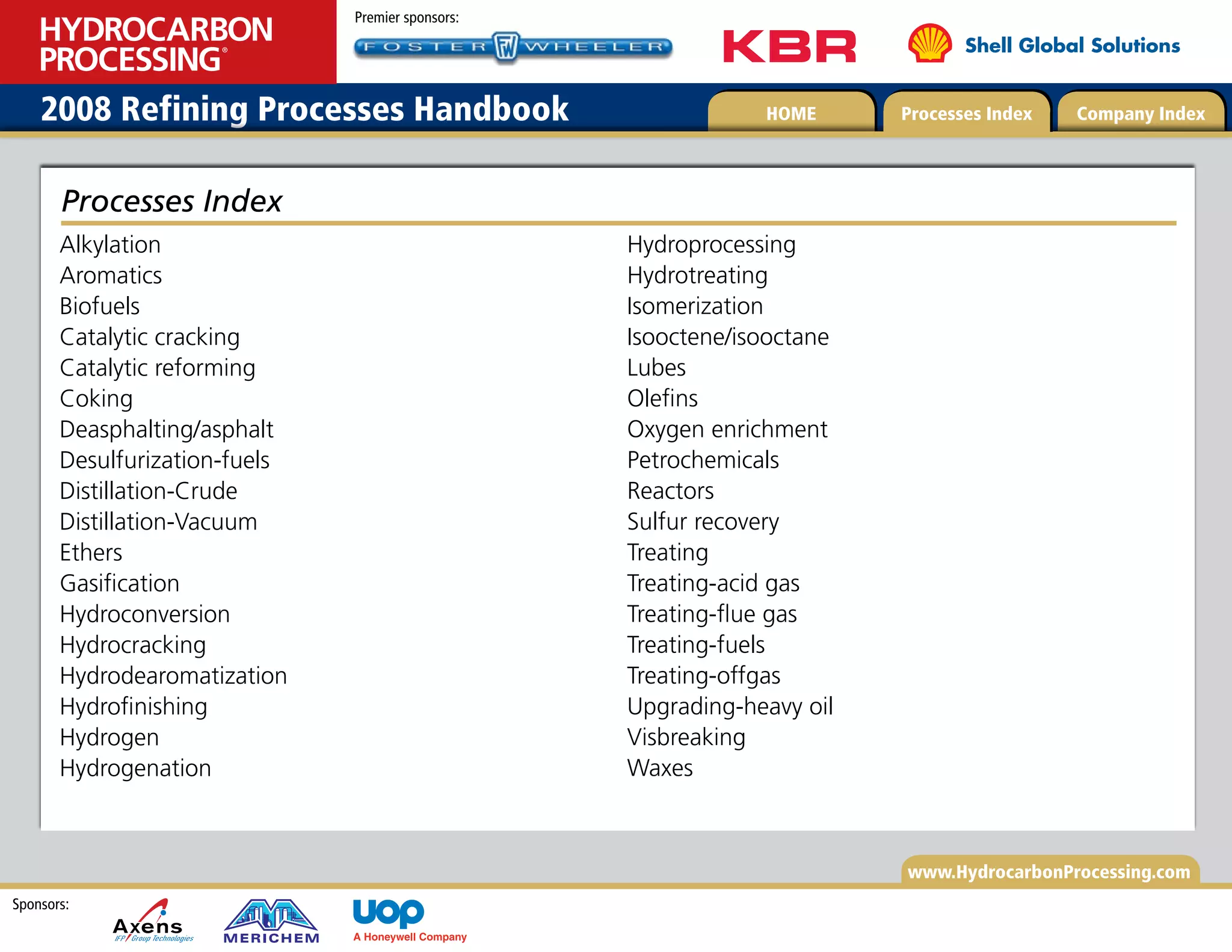 The document is a 2008 handbook from Hydrocarbon Processing that provides information on refining processes. It reflects advancements in licensed refining technologies, catalysts, and equipment. Refiners must balance investments and strategies to optimize profitability while producing cleaner transportation fuels for a global market. The handbook is a catalog of established and emerging refining technologies that can be applied to existing and new refineries. It provides expanded descriptions and information for various refining operations and processes.