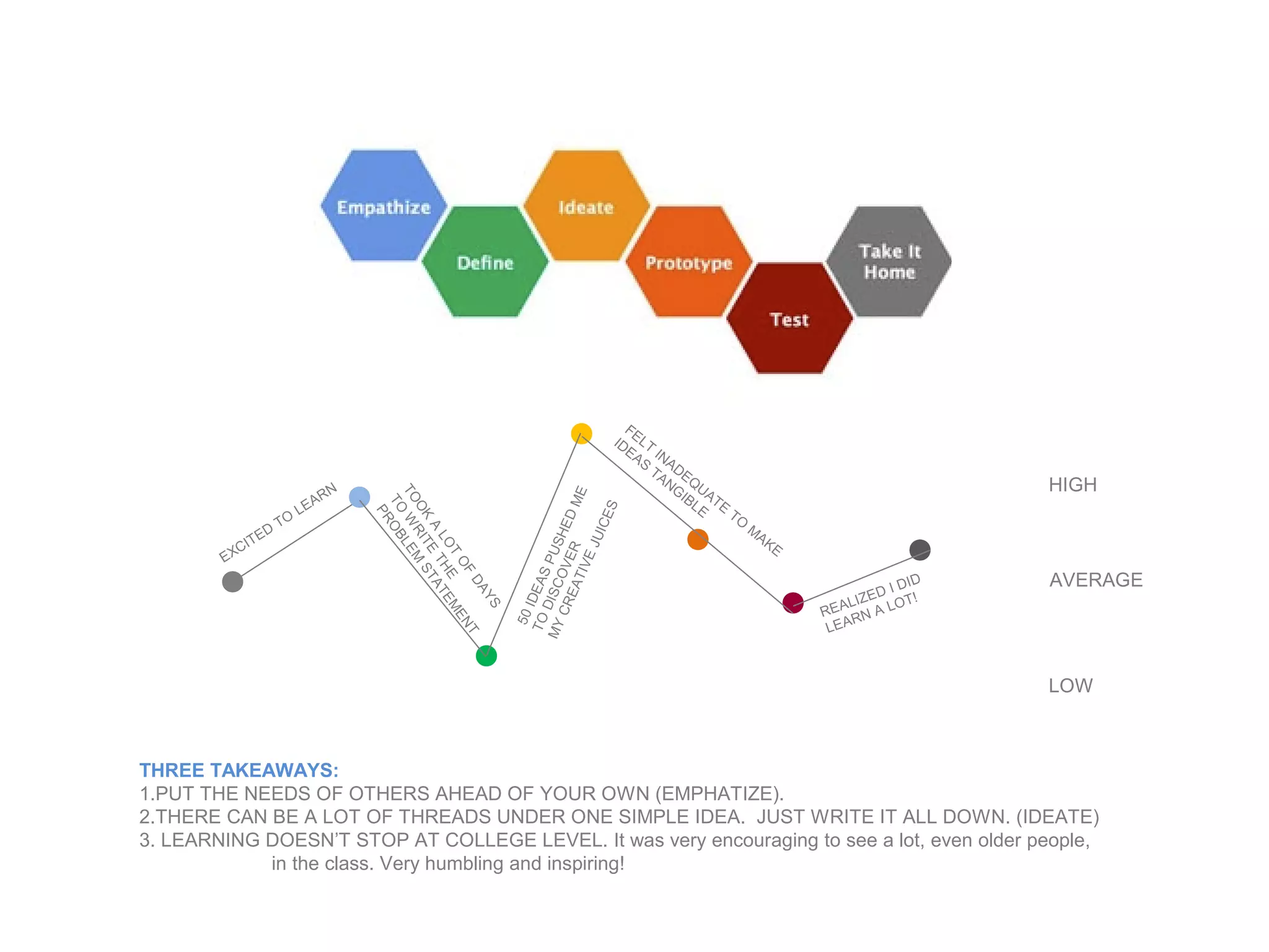 The document discusses the author's experience learning design thinking through a class. The author struggled at first to come up with a problem statement and ideas but realized they learned a lot. The three key takeaways are to empathize with others, write down all ideas related to a problem, and that learning continues beyond college. The author plans to share what they learned with Sunday School teachers to make lessons more meaningful for kids.