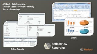 Reflect is a leading provider of digital media solutions for out-of-home environments like retail stores, using their ReflectView content management platform to power over 275,000 screens. Their solutions include both passive digital signage for promotional messaging as well as interactive touchscreen kiosks, and they help clients leverage digital and mobile channels to further engage customers. Case studies demonstrate their ability to successfully deploy large-scale digital networks for retailers to increase sales of promoted products by an average of 20% through targeted and measurable digital content.