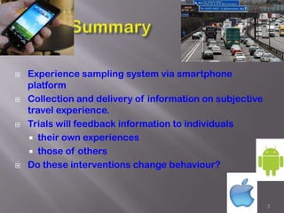 The document discusses a research project that uses a smartphone app to collect subjective travel experience data from individuals. The app will provide feedback to users about their own experiences as well as those of others. The researchers aim to see if these interventions can change travel behaviors and reduce emissions. They will draw on theories from behavioral economics, psychology, and technology acceptance. An important goal is to pilot and refine the app to make it more usable and understand its impact on travel choices over multiple trials involving both strangers and friends.