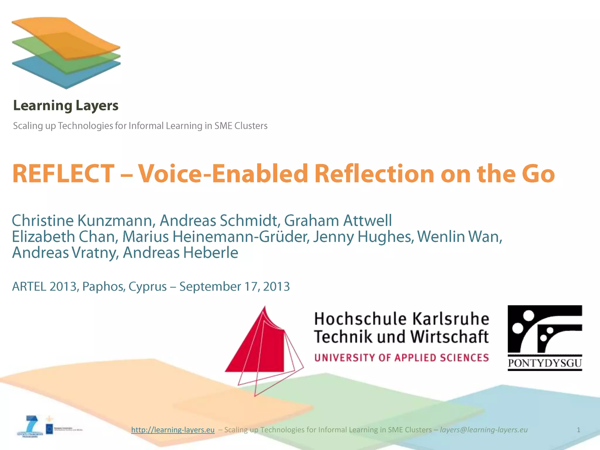 The document discusses using voice-based reflection to support workplace learning for busy professionals like general practitioners. It proposes creating reflection opportunities during time slots like commutes by allowing users to record voice responses to structured interview questions. These responses would be transcribed and sent back to allow practitioners to make their learning traceable for certification requirements while fitting it into their schedules. The questions would come from a community-developed bank that users could select, reuse or create their own decks of situational questions tailored to different types of users and situations.