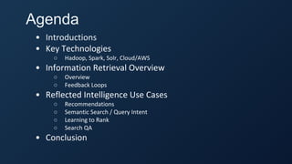The document discusses the concept of reflected intelligence and its role in data systems, particularly focusing on technologies like Hadoop and Spark, and application areas such as recommendation systems and semantic search. It emphasizes the importance of leveraging past interactions and user context to improve search relevance and user experience. Additionally, it outlines the challenges of big data processing and the mechanisms used to enhance information retrieval and ranking in enterprise search applications.