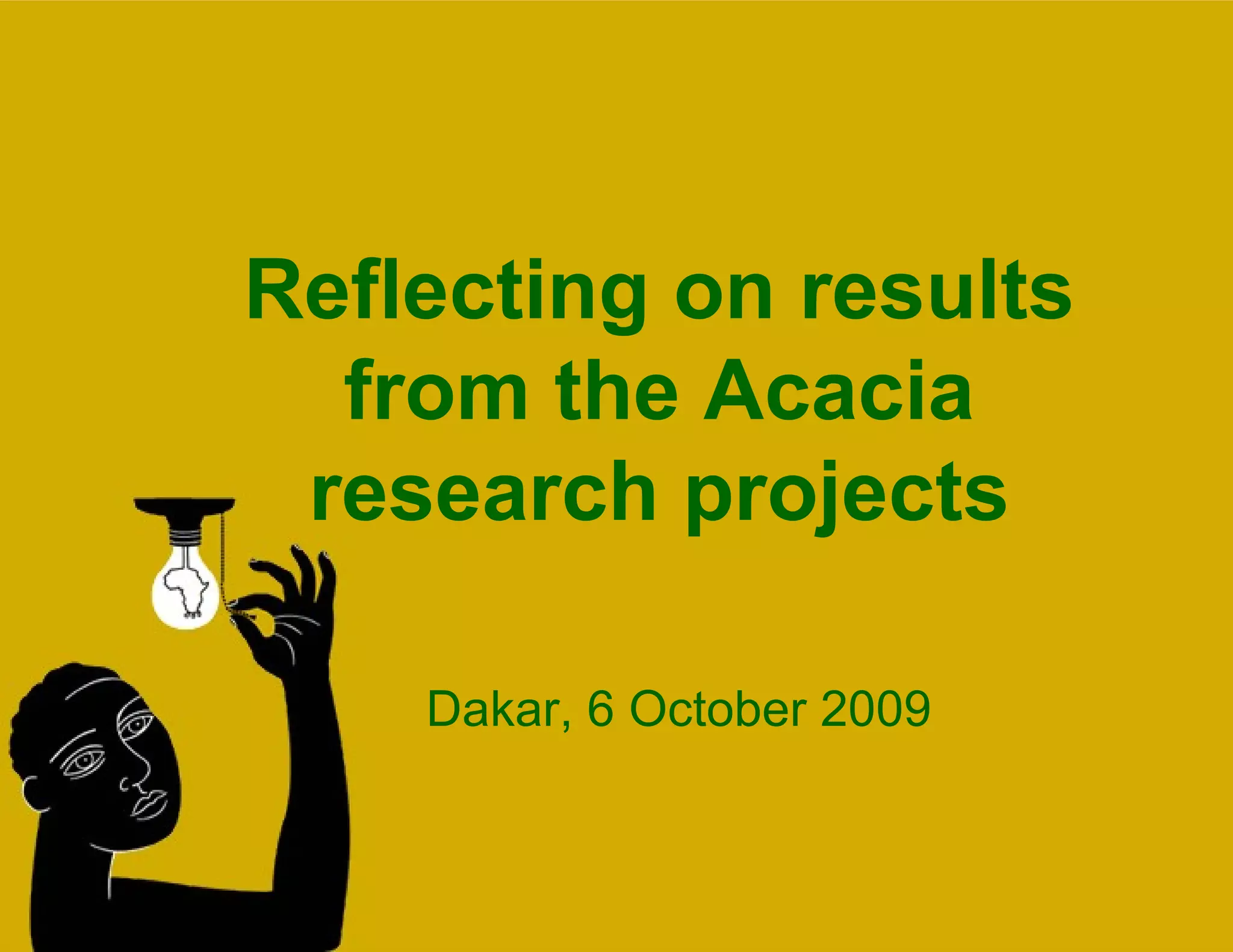 The document discusses outcomes of research projects and how they differ from outputs and impact. It provides an example of an outcome from an Acacia research project in Uganda where districts implemented an electronic health information system. The document emphasizes that outcomes are changes influenced by a project but not fully controlled by it, and can be unintended.