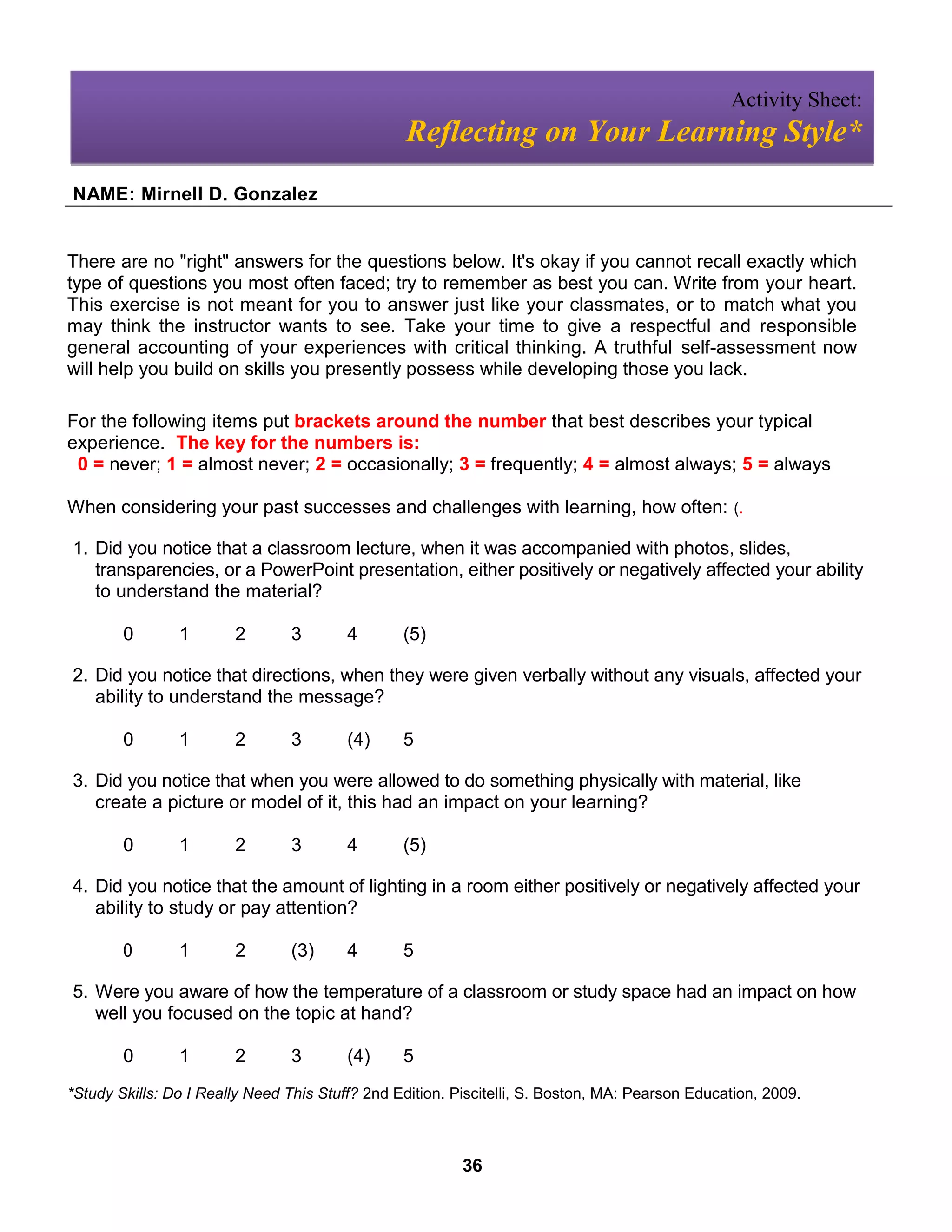 The document is an activity sheet for a student named Mirnell D. Gonzalez to reflect on their learning style. It contains questions about how different factors like visual aids, instructions, physical activities, lighting, temperature, steps, eating habits, and background noise impacted the student's ability to learn. The student is asked to score each question and calculate averages to gain insights into how they receive and understand information, and how environmental factors affect their learning. Based on their answers, the student realizes how experiences can impact learning and that understanding one's own learning style will help them succeed.