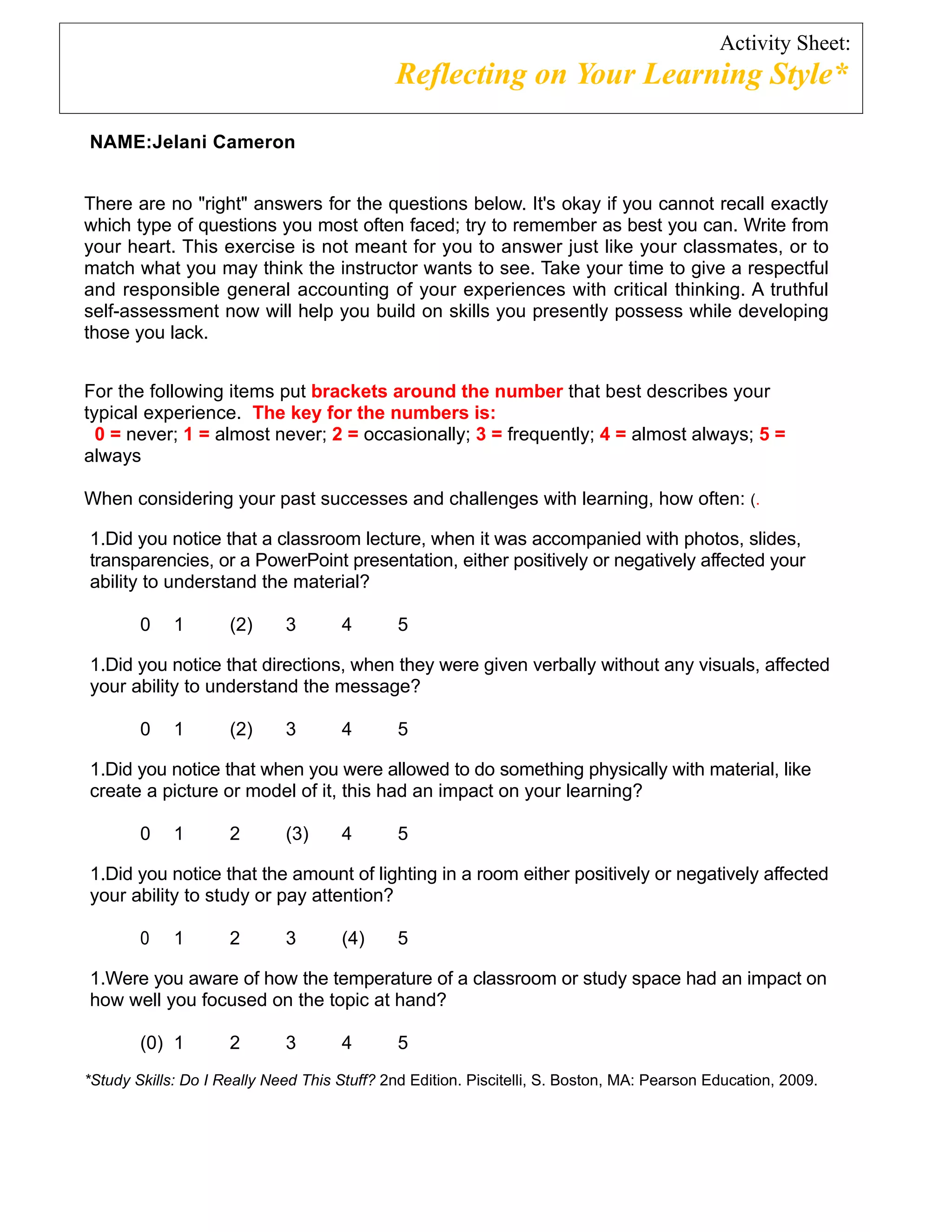 Jelani Cameron completed an activity sheet to reflect on their learning style. They rated how often various factors like visual aids, physical activities, lighting, temperature, clear instructions, eating, and noise affected their ability to learn on a scale from 0 to 5. Their average ratings indicated they are moderately aware that hands-on activities and environmental factors can impact their understanding and focus. Based on their responses, Jelani realized they learn best through hands-on activities.