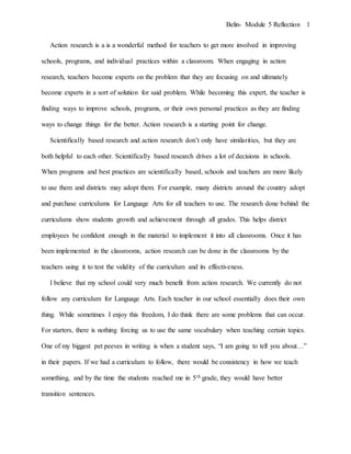 The document discusses the benefits of action research for teachers, highlighting how it helps in improving educational practices and addressing problems within schools. It emphasizes the importance of data collection in making informed decisions and the potential to establish a consistent curriculum to enhance student learning. The author also initiates an action research project aimed at increasing parental involvement through an after-school program to support students academically.