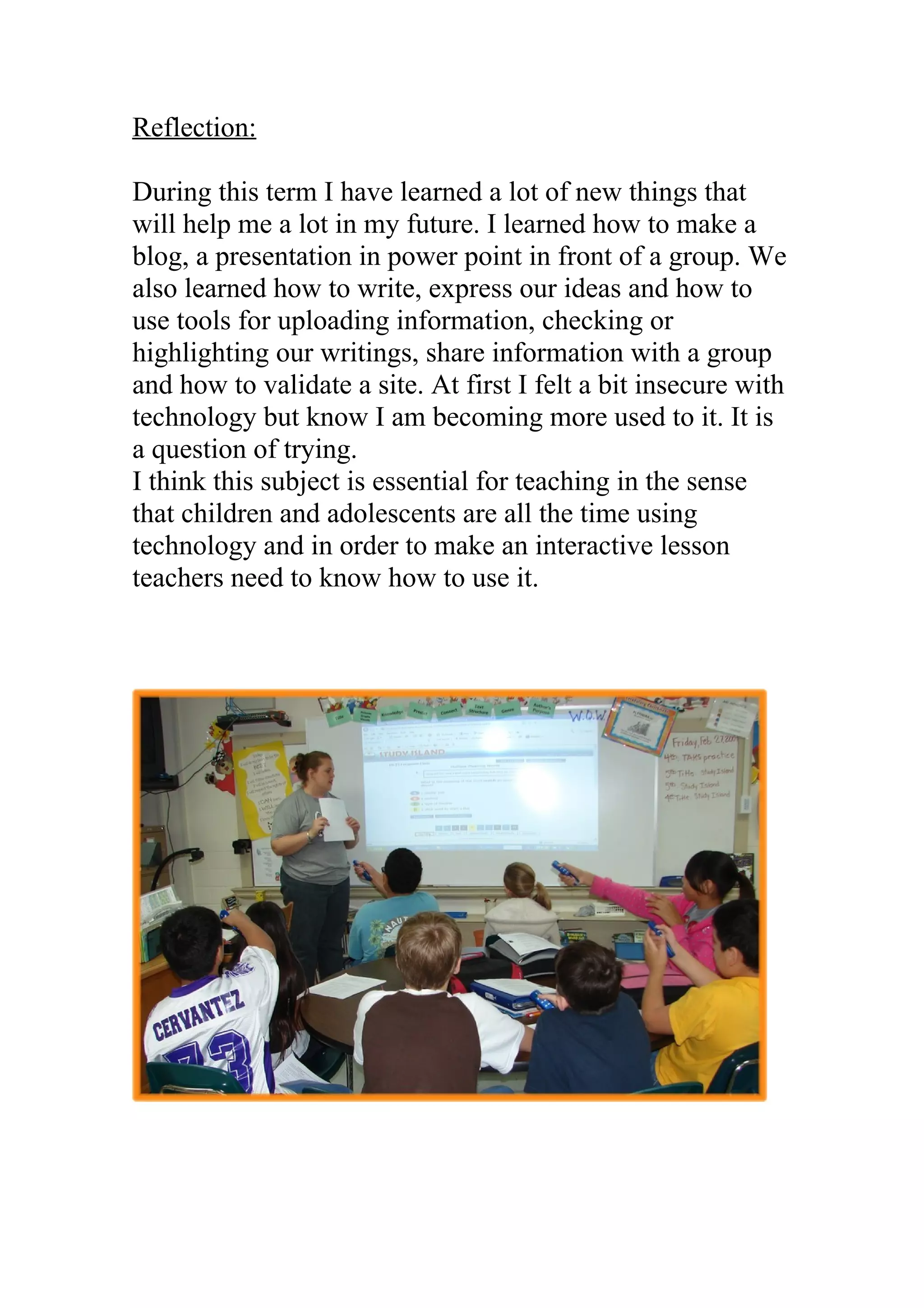 This reflection discusses what the student learned during the term, including how to make a blog, give a PowerPoint presentation, write effectively, and use tools to share information online. The student felt insecure with technology at first but became more comfortable through practice. The reflection also states that learning about technology is essential for teachers since students frequently use it, and teachers need those skills to create interactive lessons.