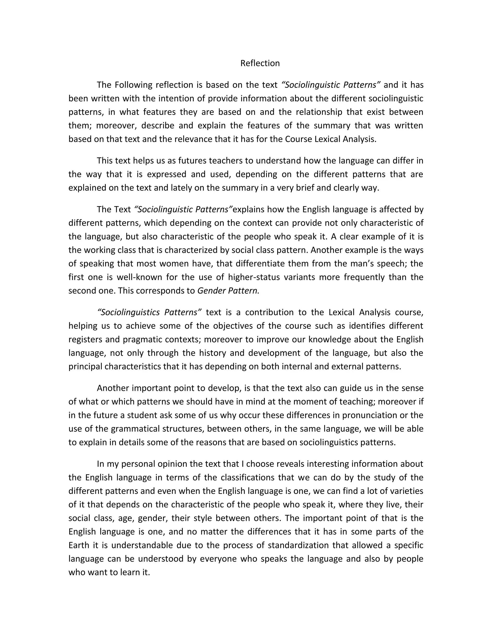 The document provides a reflection on the text "Sociolinguistic Patterns" which explains how the English language is affected by different sociolinguistic patterns based on factors such as social class, gender, and context. These patterns can provide characteristics of both the language and the people who speak it. The text helps future teachers understand how language differs depending on patterns. It also guides what patterns teachers should consider and allows them to explain differences in language to students.