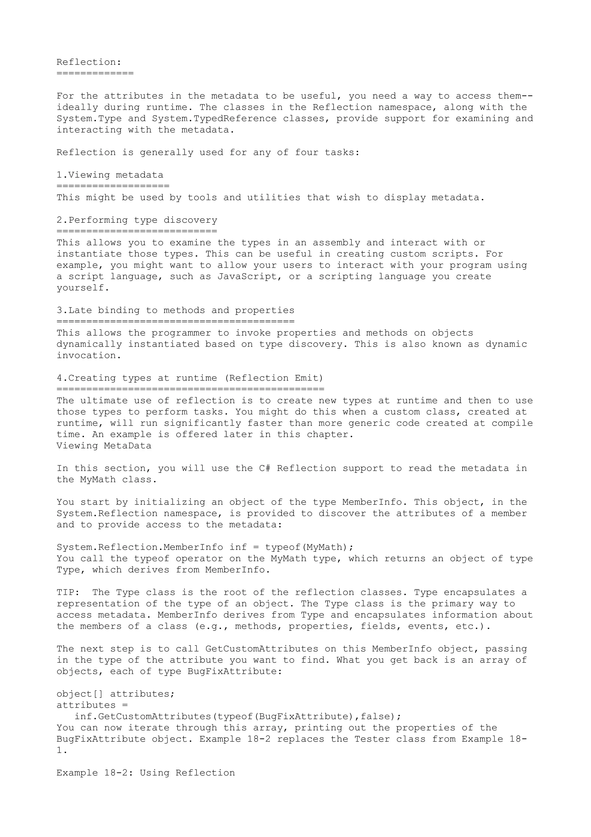 The document discusses reflection in .NET, which allows examining and interacting with metadata at runtime. It provides examples of using reflection to view metadata through attributes, perform type discovery by examining types in an assembly, enable late binding by invoking members dynamically, and create types at runtime. Specific tasks demonstrated include getting custom attributes, loading and exploring an assembly, reflecting on types and their members, and finding particular members like methods starting with "Get".