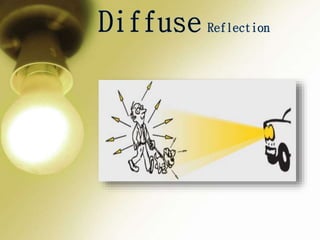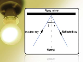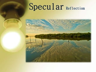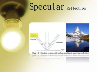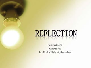 The document discusses reflection of light and its uses in ophthalmology. Reflection occurs when light rays traveling in one medium hit the boundary of another medium and turn back into the first medium. There are two main types of reflection - specular reflection which occurs from smooth surfaces and causes light to reflect at the same angle, and diffuse reflection which occurs from rough surfaces and scatters light in all directions. In ophthalmology, the cornea's anterior surface acts as a convex mirror and reflection is used by instruments like the keratometer.