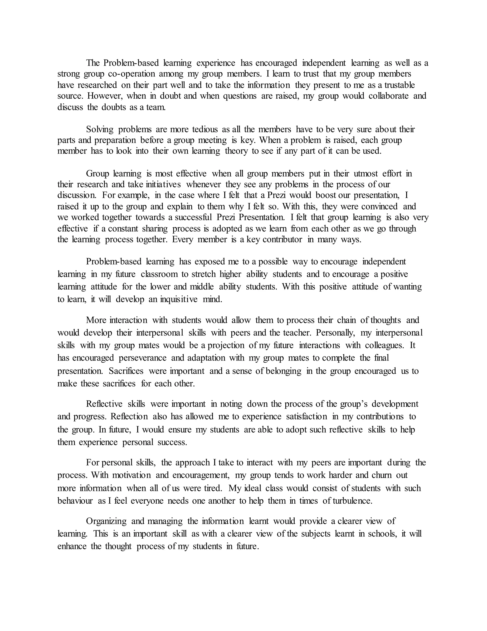 The Problem-based learning experience encouraged independent learning and strong cooperation among group members. Group members had to thoroughly research and prepare their topics to discuss doubts as a team. Effective group learning required all members to put in effort in research and take initiatives to solve problems together. The experience exposed the author to encouraging independent learning in future classrooms and developing students' interpersonal and reflective skills through interaction and group work. It also helped the author improve personal skills like motivation and organization, which will benefit students.