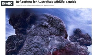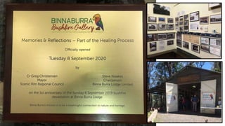 The document discusses the creation of reflection benches at Binna Burra to commemorate the impact of bushfires that devastated the area in September 2019. It highlights the environmental damage caused by the fires, including significant loss of life and wildlife, and emphasizes the community's resilience and hope for the future. Additionally, it addresses the psychological effects of such natural disasters on individuals and communities.