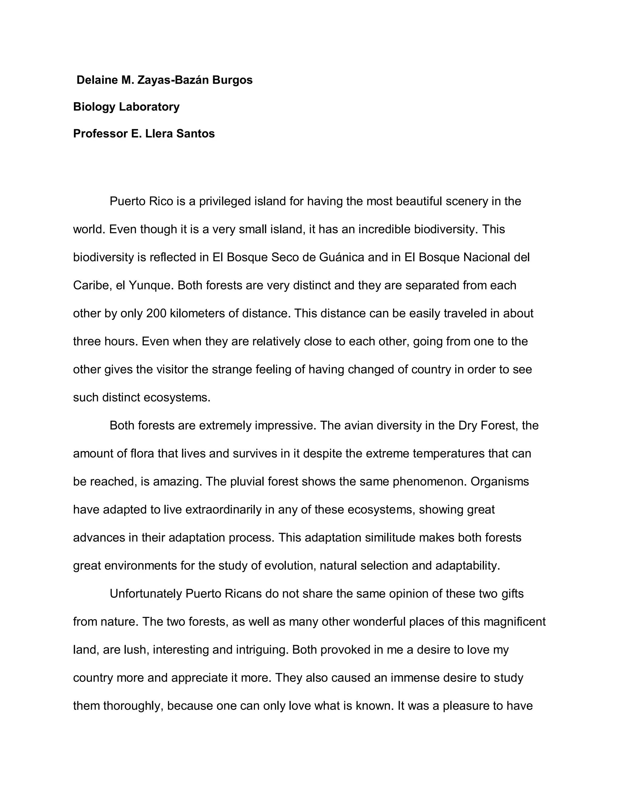Puerto Rico has incredible biodiversity despite its small size, as reflected in El Bosque Seco de Guánica and El Bosque Nacional del Caribe, el Yunque forests. Though only 200km apart, the distinct ecosystems of the dry forest and pluvial forest give visitors a sense of traveling between countries. Both forests impress with their diverse flora and fauna that have uniquely adapted to survive in their environments, making them ideal places to study evolution, natural selection, and adaptability. The author was inspired to love and appreciate Puerto Rico more after visiting these two gifts of nature and desires to study them further, as one can only love what is known.