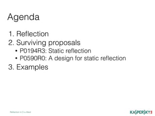 The document discusses the development of static reflection in C++, highlighting key proposals and concepts such as type introspection and metaprogramming. It describes the core language and library changes necessary for static reflection, with examples of its implementation and use cases. Additionally, the document contrasts two proposals (p0194r3 and p0590r0) and outlines the pros and cons of static reflection in the context of C++ programming.