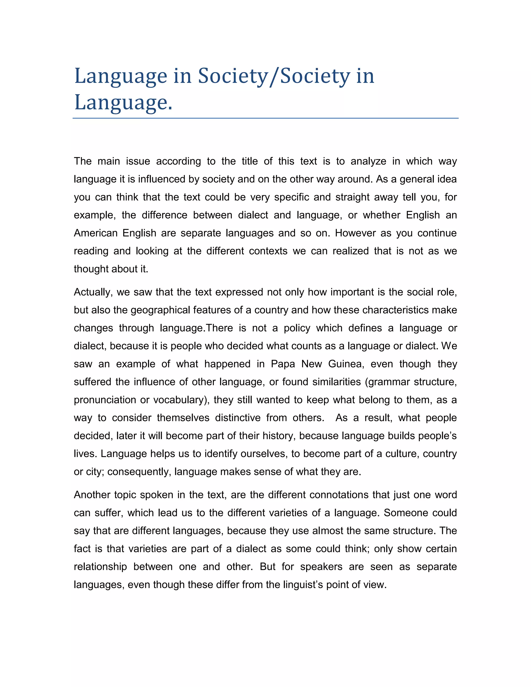 The document discusses how language and society influence each other. It explores how social and geographic factors can lead to changes in language over time. While languages and dialects are often defined by linguists, communities themselves decide what constitutes a language or dialect based on their history and culture. The text also examines how single words can take on different meanings in different contexts or regions, demonstrating the complex relationship between language variations.