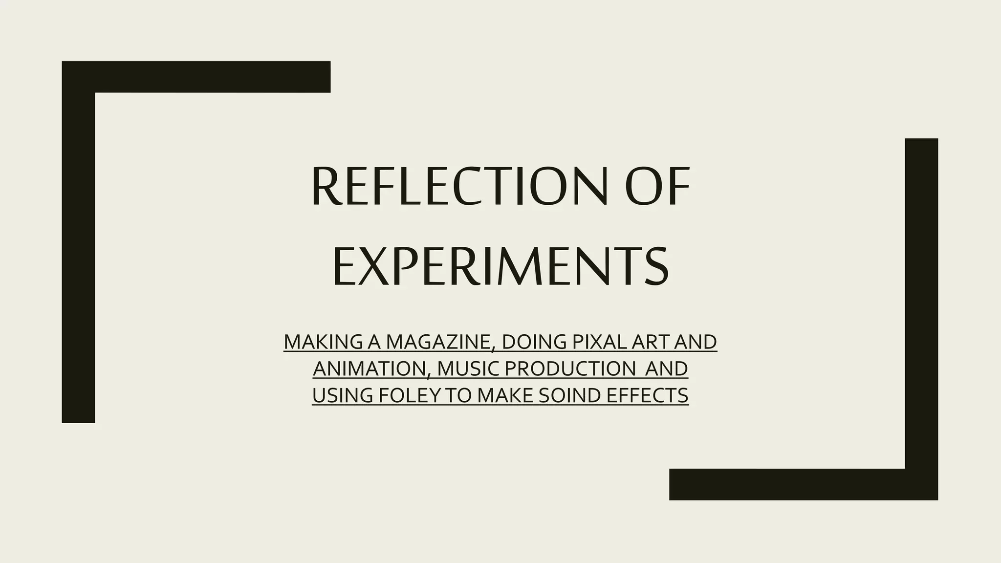 The document reflects on various digital media experiments including making magazines, pixel art and animation, music production, and Foley sound effects. For the magazine experiments, feedback helped improve the second magazine which had a darker color scheme and single focal point compared to the first magazine. Creating pixel art and animation in Photoshop was found to be surprisingly easy but room for improvement in drawing skills. Basic music was made using BeepBox but copyrighted music will likely be used instead. The film poster experiment demonstrated that a simpler design with a clear focal point was most effective. Creating sound effects at home helped realize the ability to make custom sounds for games. Overall, the experiments provided valuable lessons that will inform future digital media projects.