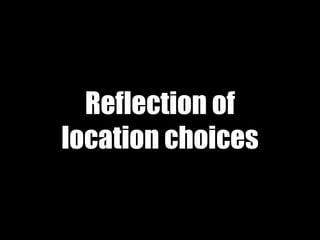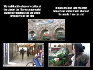 The document reflects on location choices for a film. It finds the first urban location successful as it emphasized the film's urban style and looked realistic. The second location with graffiti was also successful as it captured the gang's vibe and looked aesthetically pleasing, though having fewer cars would have made the set look more deserted and scary for greater effect.