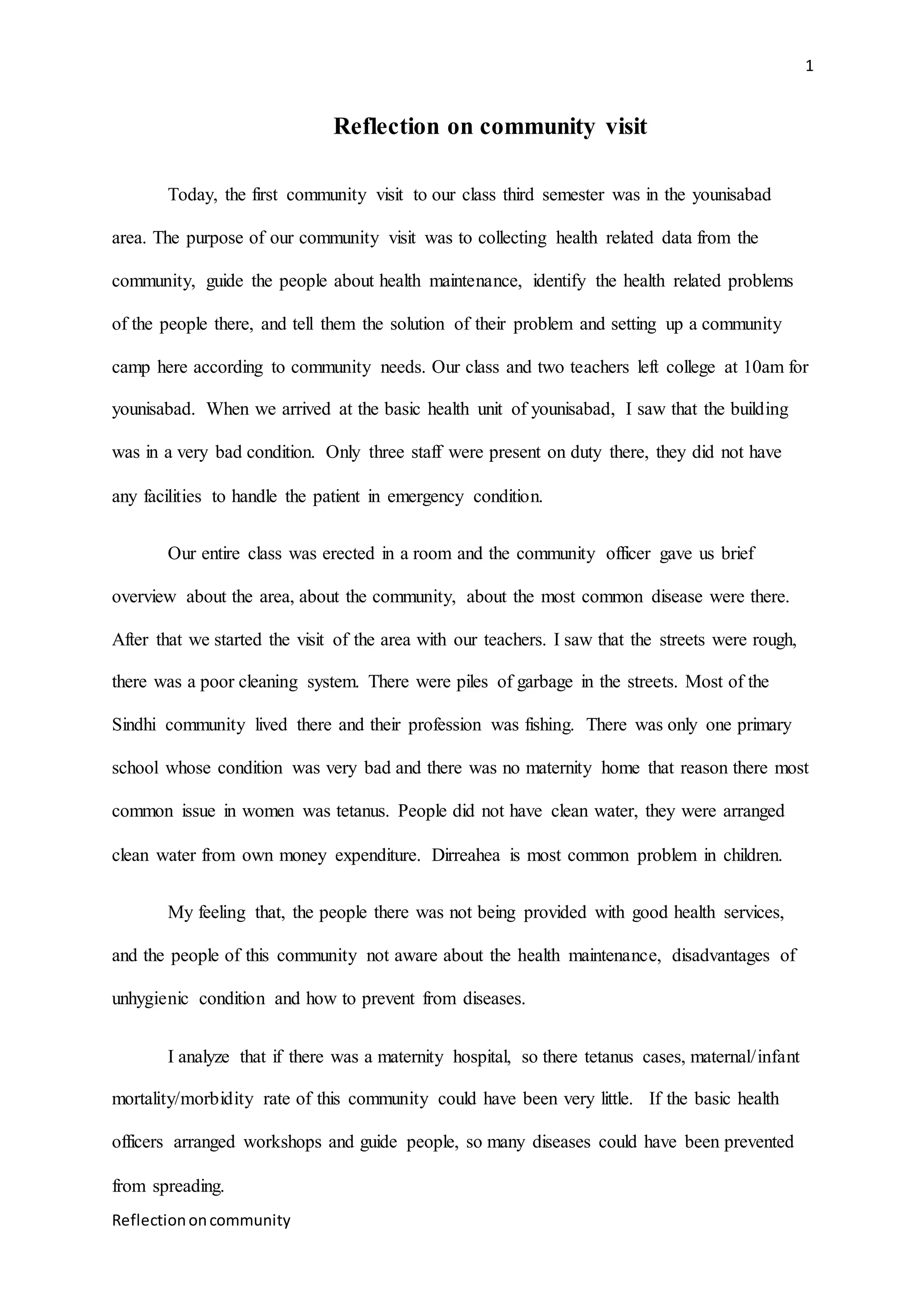 The document reflects on a community health visit in Younisabad, highlighting the poor conditions of health facilities and the prevalence of health issues such as tetanus and diarrhea among residents. It emphasizes the lack of awareness about health maintenance and suggests the need for workshops and improved health services. The author concludes that better nursing practices and government support could significantly reduce disease in the area.
