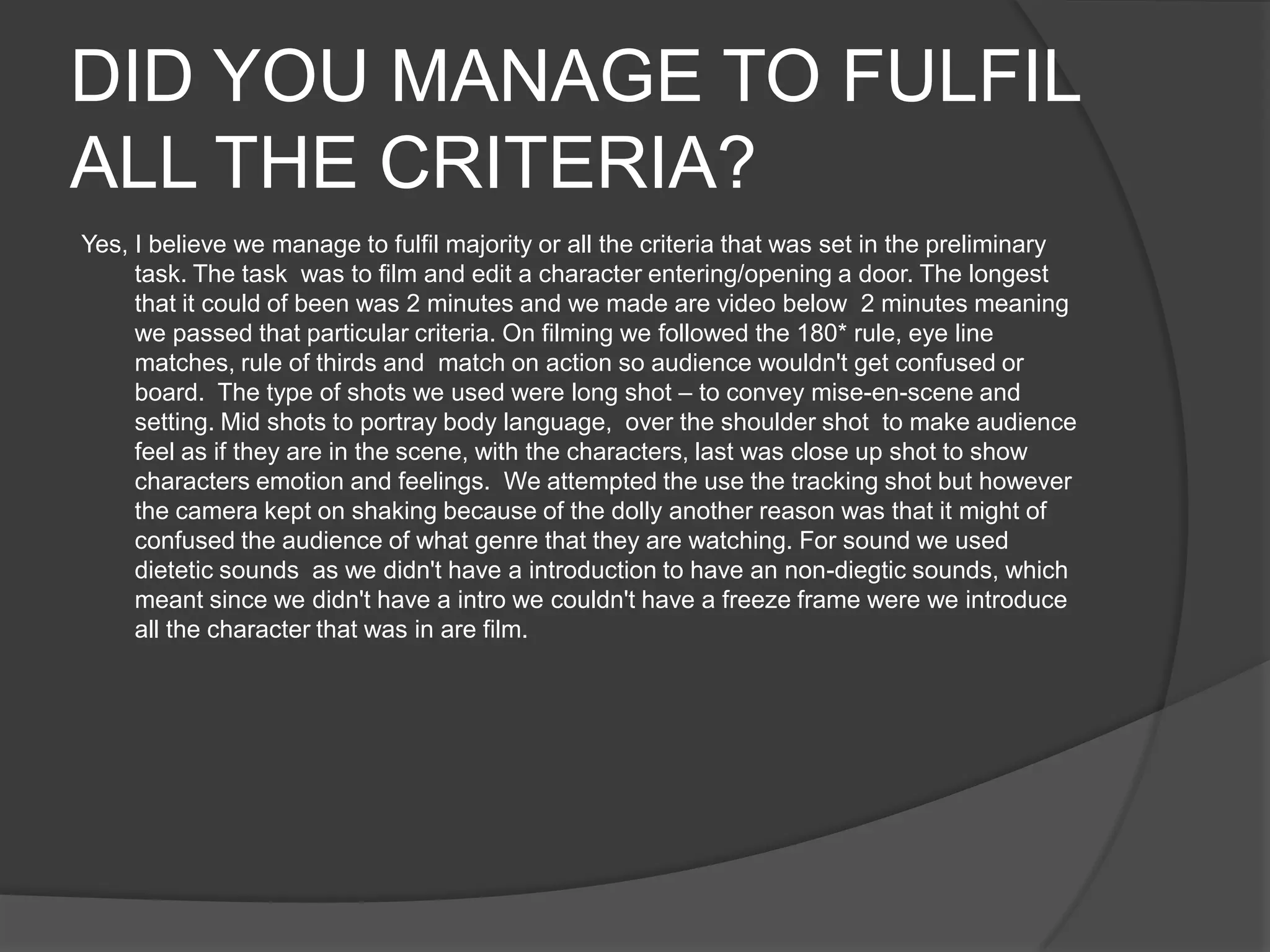 The student believes they fulfilled most or all of the criteria for the preliminary task of filming a character entering or opening a door in under 2 minutes. They followed cinematography techniques like the 180 degree rule and used different shot types like long shots, mid shots, and close ups. Filming was difficult due to issues like actors' expressions, background noise, and lighting conditions at different times of day. The best times to film were during lessons and after school to avoid interruptions. Editing in Final Cut Pro taught the student how to upload footage, trim clips, change lighting, organize bins, and export a finished video.
