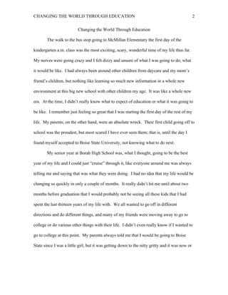 Bree Hohnbaum discusses her journey to becoming a teacher. She shares experiences from her childhood education, struggles in college, and finding her passion for teaching. She realized in 7th grade she wanted to be a teacher after learning about the impact teachers can have. Though she struggled in her early years of college, she found success at Community College of Western Idaho and is now studying to become an elementary school teacher. She believes that education can change the world and that teachers are the future.